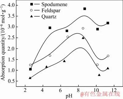 混合捕收剂溶液初始浓度为6×10-4 mol/L,采用总有机碳分析仪(TOC)对捕收剂在矿物表面的吸附量进行了测定,结果见图7。由图7可知,相同pH条件下混合捕收剂在锂辉石表面的吸附量均大于长石和石英,且在pH=8.7附近时,捕收剂在三种矿物表面的吸附量都达到最大。由此可见,油酸与十二胺混合捕收剂在提高锂辉石可浮性的同时,兼具良好的选择性。